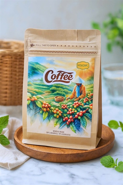 - Pha Trộn Đặc Biệt: 30% Arabica và 70% Robusta, kết hợp hài hòa giữa vị chua nhẹ và đắng mạnh mẽ.